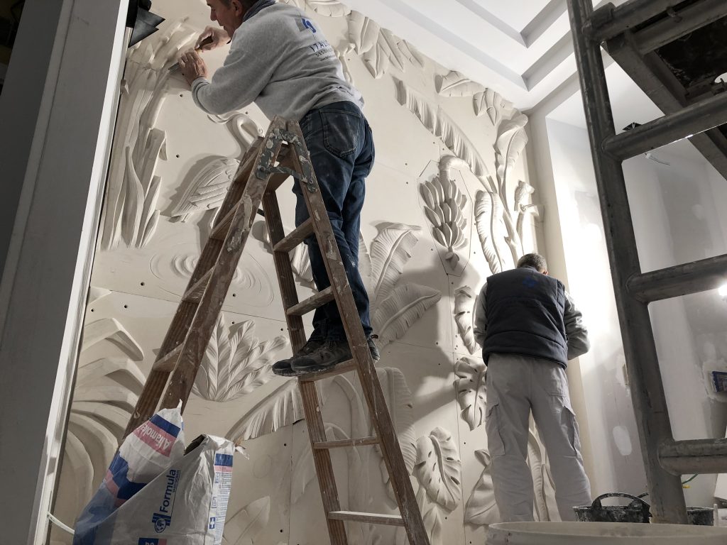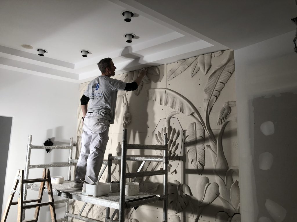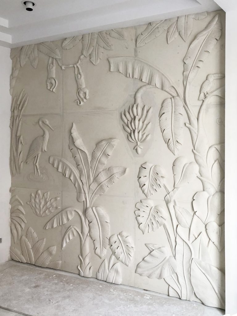 El corazón del espacio fue un gran mural de escayola de 3 x 3 metros tallado a mano. Con un diseño de inspiración tropical, esta pieza de bajorrelieve transformó por completo el ambiente, narrando una historia con sus hojas de esqueleto, plataneras, monos, un tucán y una garza. El jurado de Casa Decor reconoció la excelencia de su ejecución, otorgándole el Premio al Mejor Diseño Original. La mención especial destacaba la "excelente conexión en el desarrollo del trabajo entre el interiorista y los artesanos escayolistas", un claro reconocimiento a la calidad de nuestra colaboración y a nuestra maestría técnica.