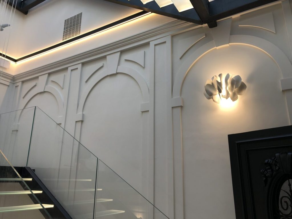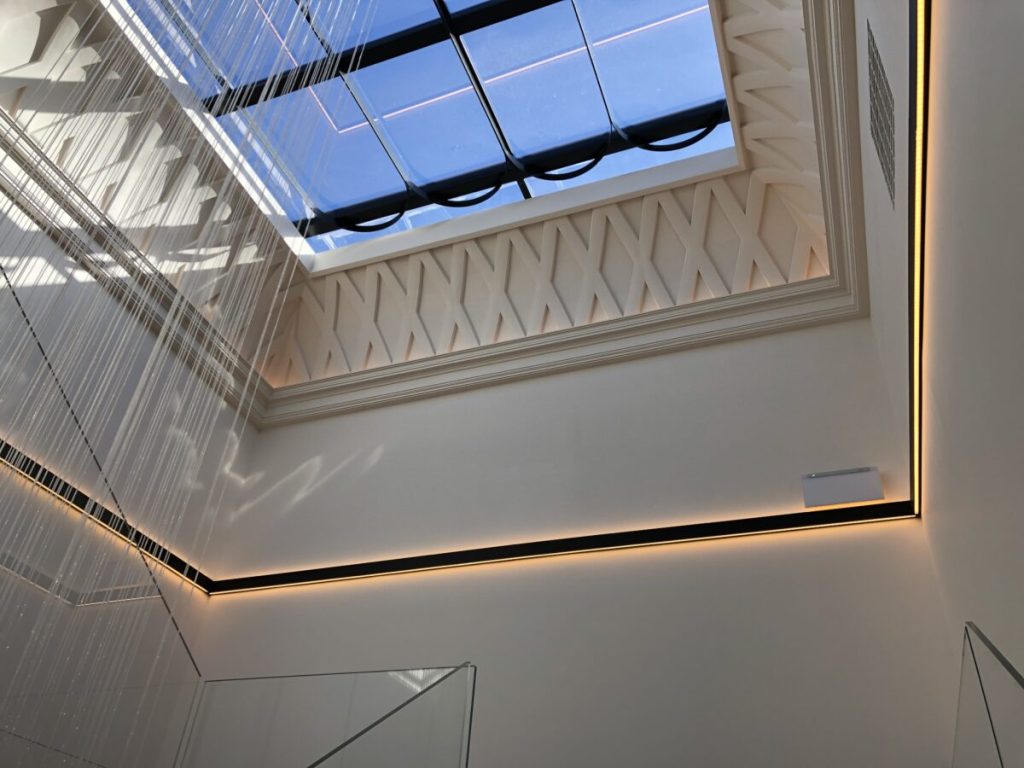 • Lucernario a medida: Para el tragaluz, fabricamos cornisas curvas y lisas de gran tamaño, adaptadas con huecos para la iluminación LED, realzando la composición de varias cornisas y el efecto de luz natural.