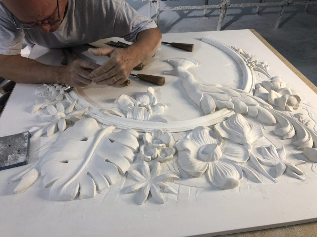 1. Restauración del patrimonio: En estancias como la Suite Lladró, realizamos una minuciosa restauración y reconstrucción de los techos de escayola decorados. Con escayola especial de alta dureza, reproducimos cada detalle, desde frisos y molduras hasta plafones y tallas originales, conservando la esencia del pasado.