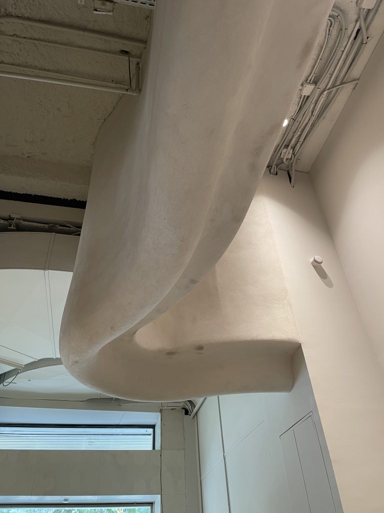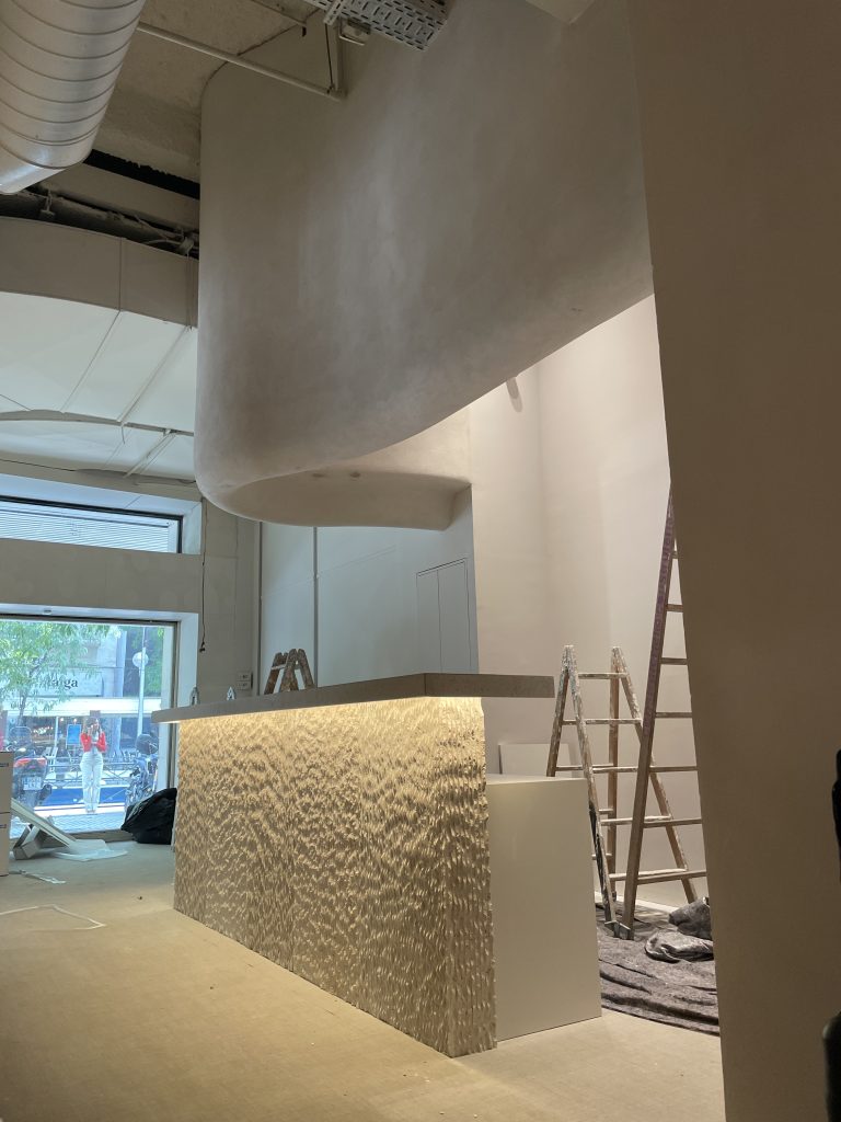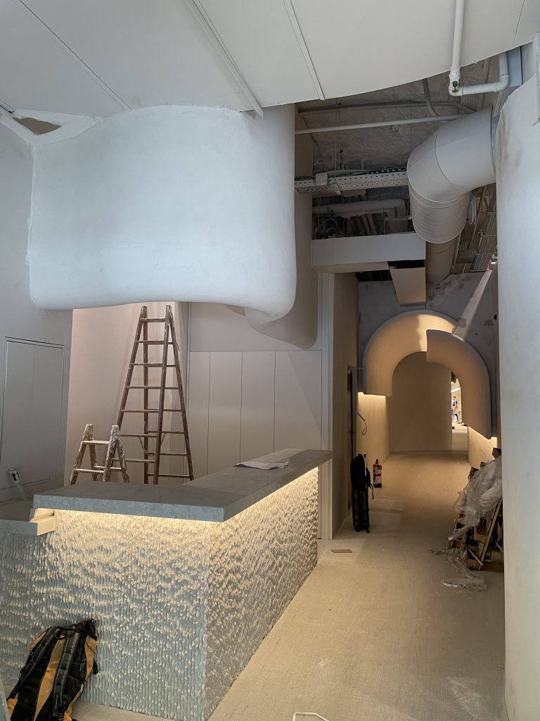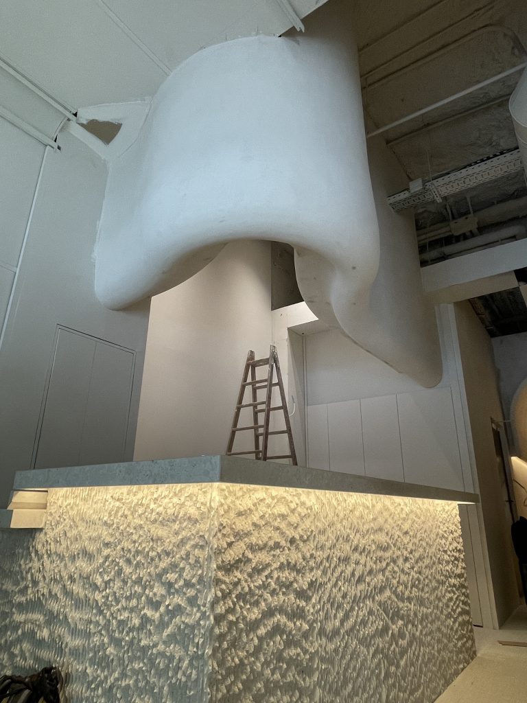 Además de la lámpara, nuestra labor fue crucial para el diseño del espacio al completo, al fabricar un techo que simulaba una tela arrugada. Esta solución artesanal a medida no solo creó una textura única y sorprendente, sino que ayudó a reforzar el concepto de calidez y suavidad, envolviendo el espacio de forma fluida y orgánica.