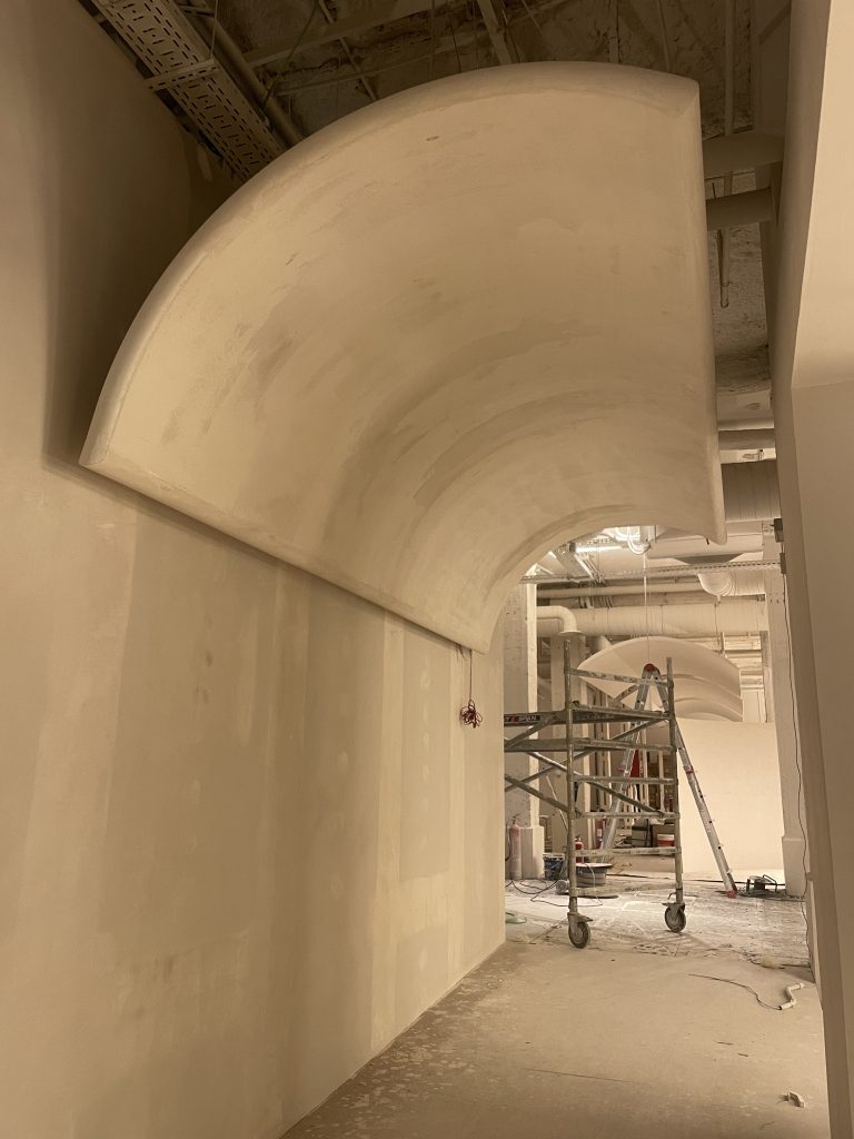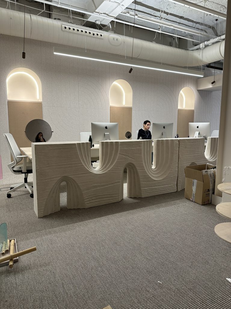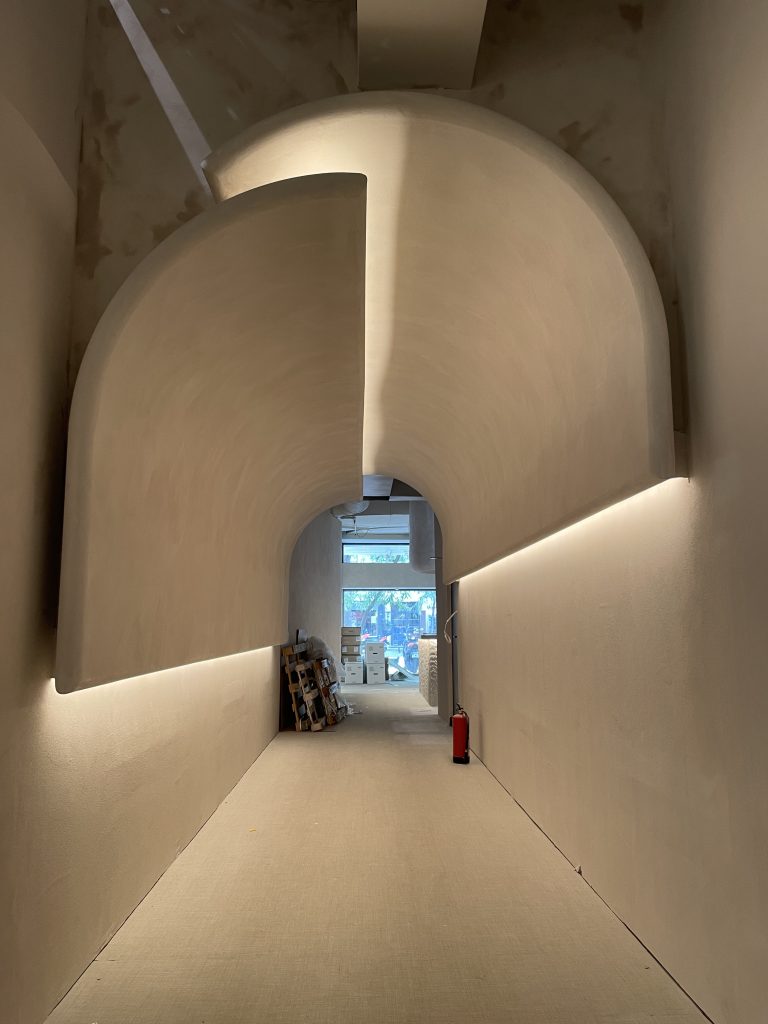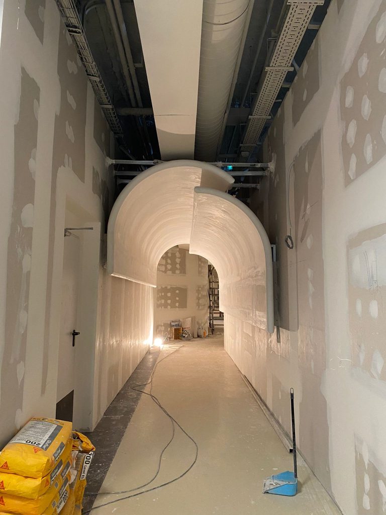 Además de la lámpara, nuestra labor fue crucial para el diseño del espacio al completo, al fabricar un techo que simulaba una tela arrugada. Esta solución artesanal a medida no solo creó una textura única y sorprendente, sino que ayudó a reforzar el concepto de calidez y suavidad, envolviendo el espacio de forma fluida y orgánica.