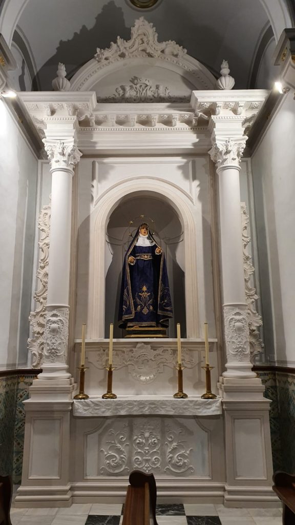 El encargo que recibimos era tan claro como exigente: diseñar y fabricar un retablo de estilo clásico que no solo sirviera como un nuevo y funcional altar, sino que también proporcionara una hornacina sublime para una venerada imagen de la Virgen en su Soledad. La responsabilidad era inmensa. El objetivo era doble y requería un equilibrio perfecto. Por un lado, debíamos crear una pieza artística de un valor estético incuestionable, una obra que por sí misma realzara la belleza intrínseca y el valor devocional de la talla sacra. Por otro lado, y con igual importancia, el retablo debía integrarse con una armonía absoluta en la arquitectura preexistente y en el ambiente de paz y recogimiento que define a la capilla, convirtiéndose en parte del espacio sin dominarlo, sino complementándolo.