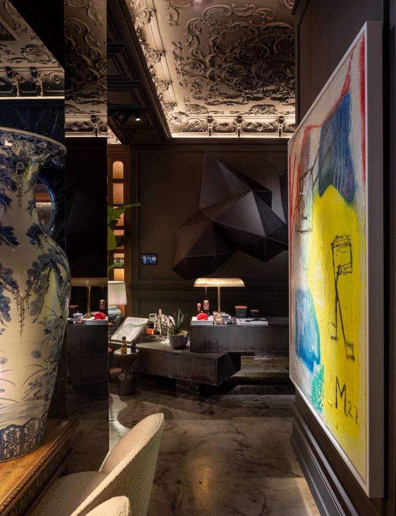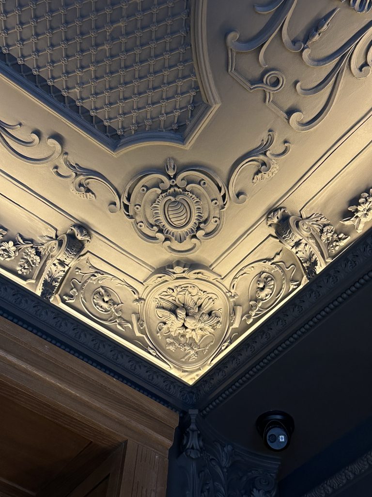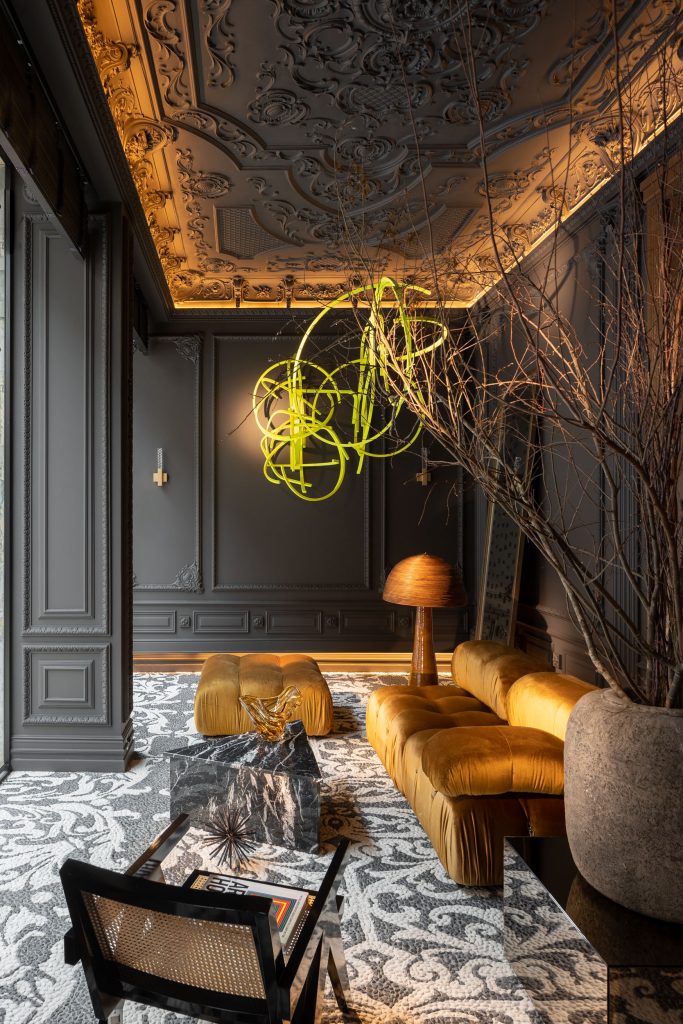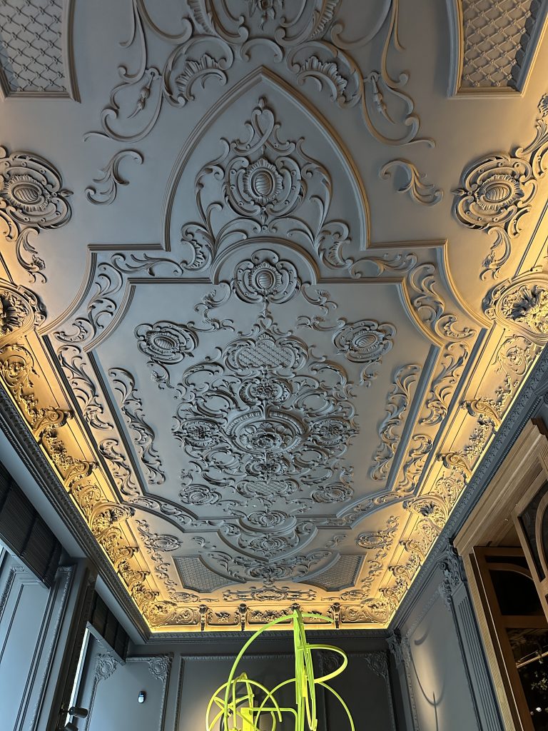 El resultado es la prueba de cómo la escayola artesanal puede ser el hilo conductor en un proyecto de autor. Los techos de estilo palaciego que creamos para Velutto son más que una simple decoración de techo; son un elemento que dialoga con los muebles de diseño, las lámparas de Murano y las obras de arte que pueblan el espacio.