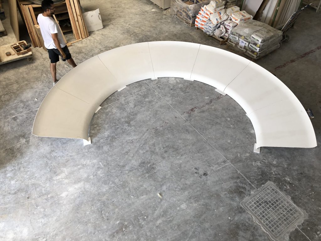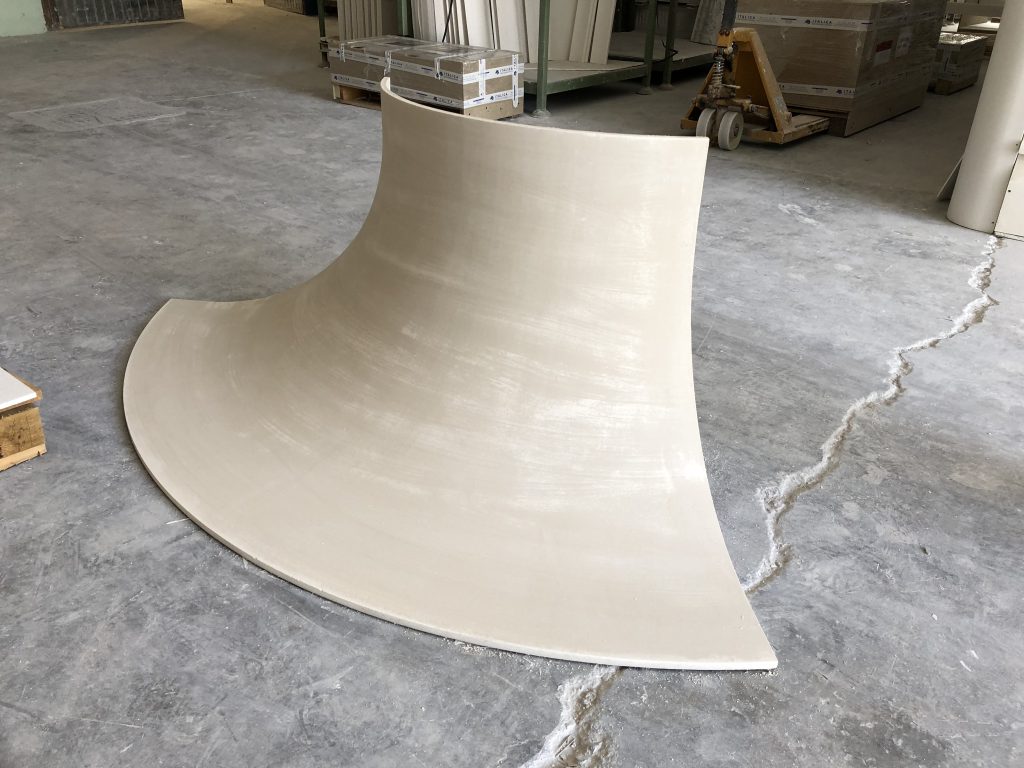 - Geometría y fluidez: Creamos infinitas piezas curvas para sistemas PYL en techos y tabiques, que se funden con las paredes y el mobiliario como un solo elemento. También fabricamos barandillas ovaladas con secciones casi imposibles, así como delicados lucernarios y curvas para encuentros entre pared y techo, aportando una sensación de movimiento orgánico a cada rincón.